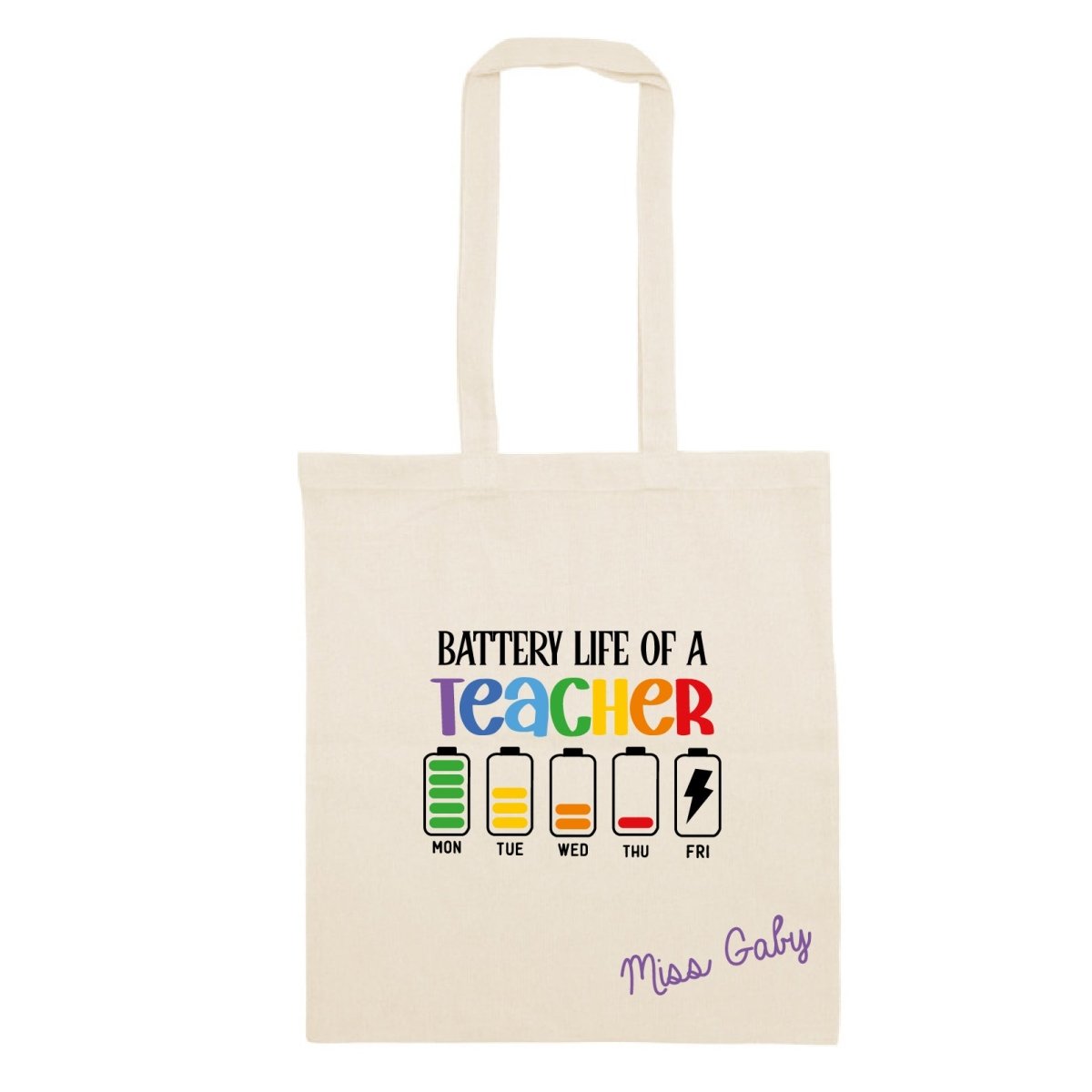 Bolsa reutilizable de algodón con diseño ideal para profesores y profesoras. Battery Life of a Teacher y con opción de agregar el nombre de quién la utilizará. La bolsa es 100% algodón, ideal para llevar cualquier cosa en el día a día.
